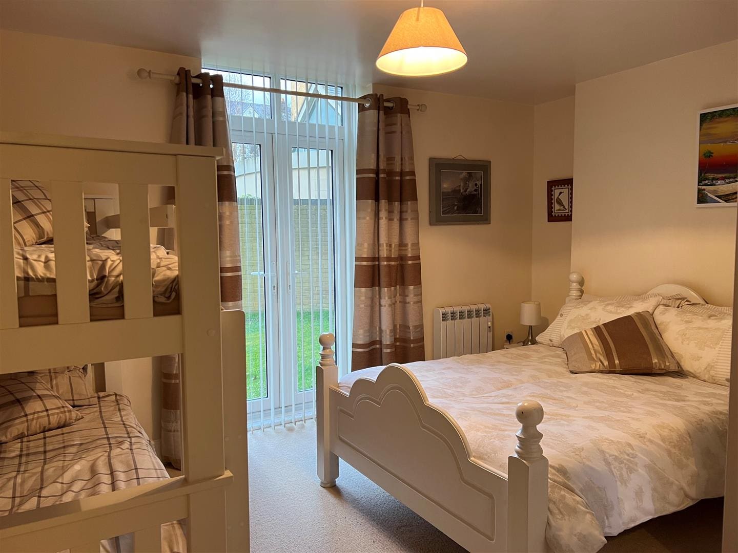 A double bedroom with patio doors leading out onto the communal lawn. This room has a carpet and an electric radiator.
