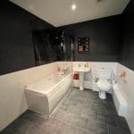 The main bathroom is a generous size with a tiled floor, W.C. hand wash basin , bath with shower over and a shower screen. The walls are partially tiled and the shower is lined with a marble effect splash back.