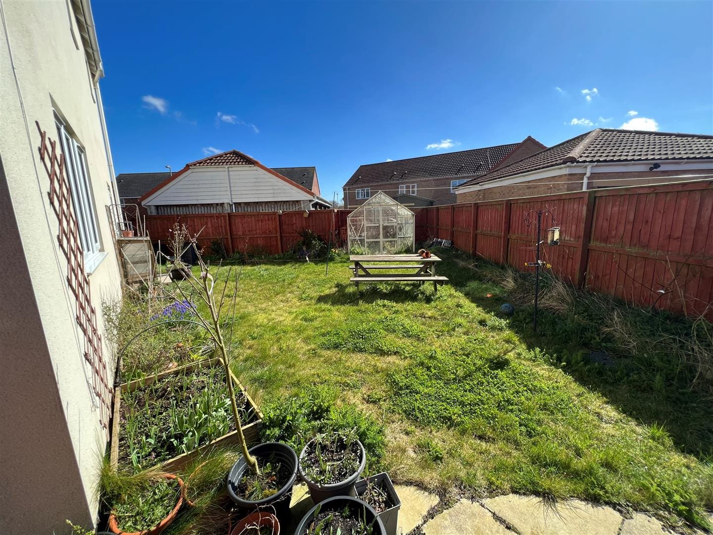 To the front of the house there is a canopy over the door to keep visitors dry. There are small hedges and a pretty front garden wrapping around the front of the property. There is a gate to the side of the house leading into the back garden which is largely laid to lawn with a decked seating area and a greenhouse.