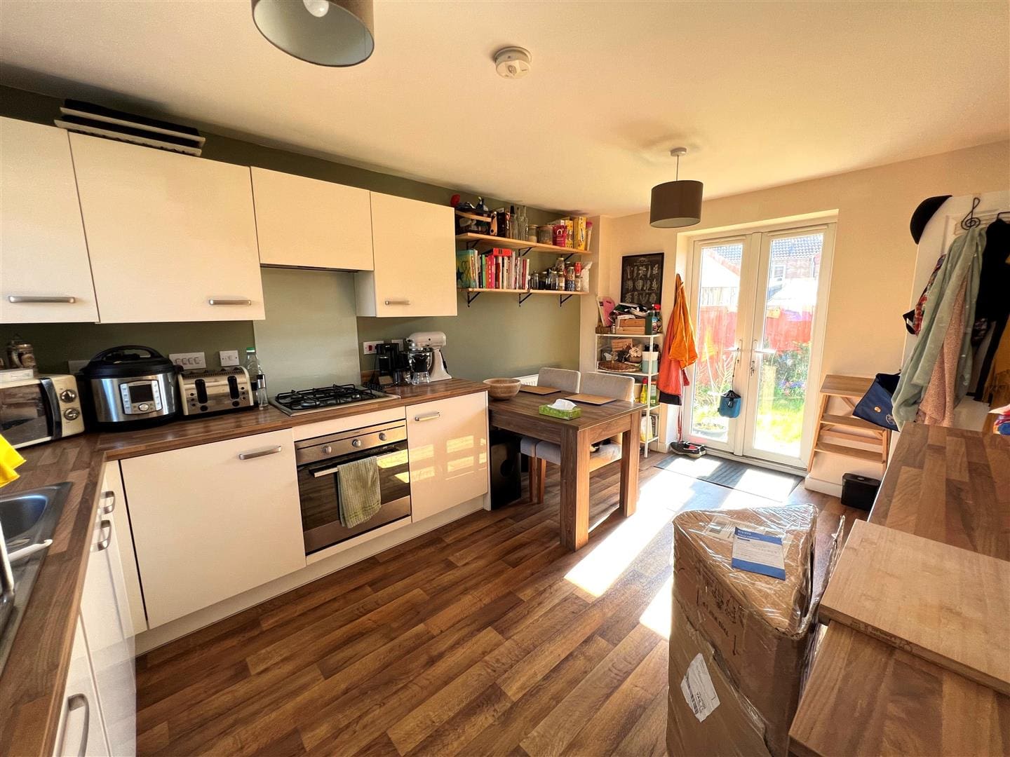 Located off the front hallway the kitchen has a window to the front of the property and double patio doors to the rear overlooking the garden. There is a range of base and wall units with wooden counter tops, a radiator and a stainless steel sink and drainer. There is a built in oven, with a gas hob and extractor, there is space for a washing machine and a built in dishwasher. There is also room for a dining table and chairs. There is also a pantry storage cupboard under the stairs with plenty of storage.