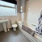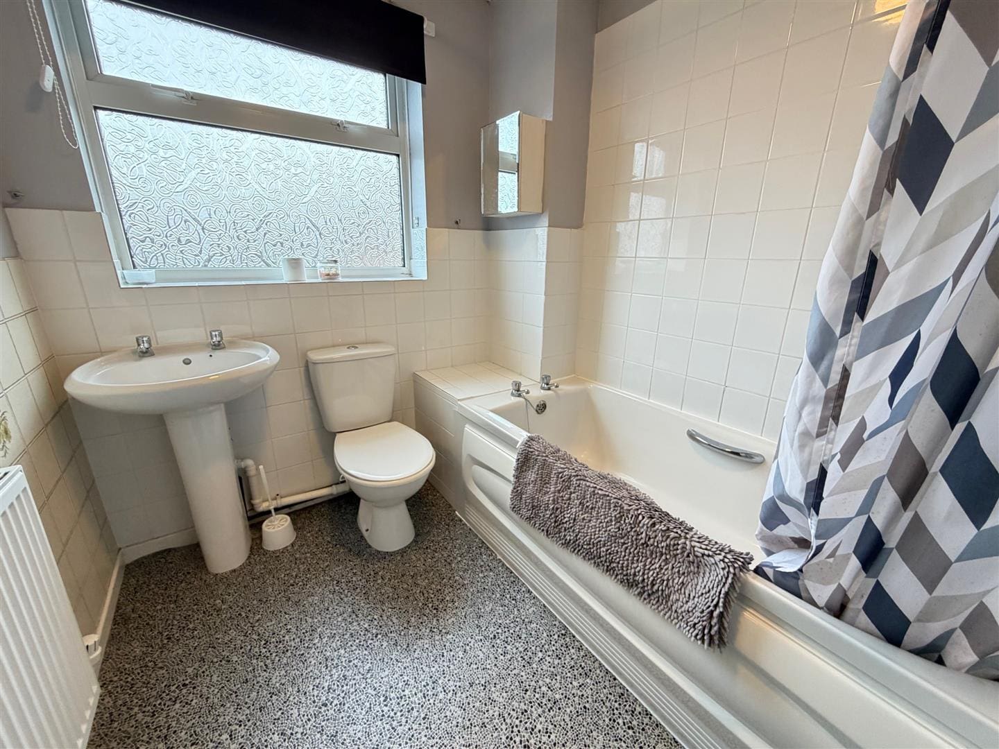 with white three piece suite, shower over the bath, radiator and window