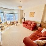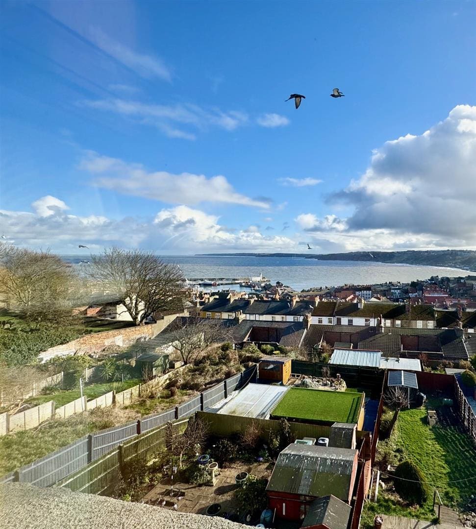 Rear facing UPVC Bay Fronted window overlooking the South Bay. Overhead light, dado rail and radiator.