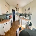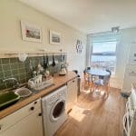 Range of wall, drawer and base units, worktop, stainless steel sink and tiled splashback. Space for gas cooker and extractor fan over. Spaces for fridge and washing machine, integrated dishwasher and overhead light. Wall mounted boiler. Space for dining table and window overlooking the South Bay.