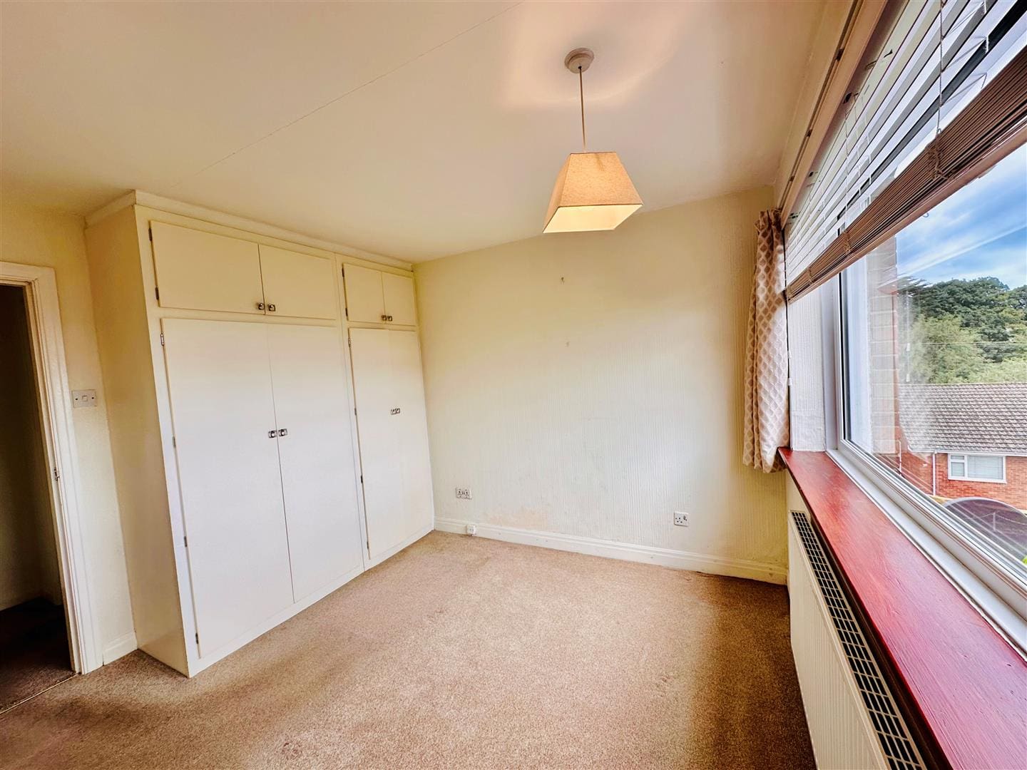 Front facing window with views towards the castle. Overhead light, radiator and fitted wardrobe.
