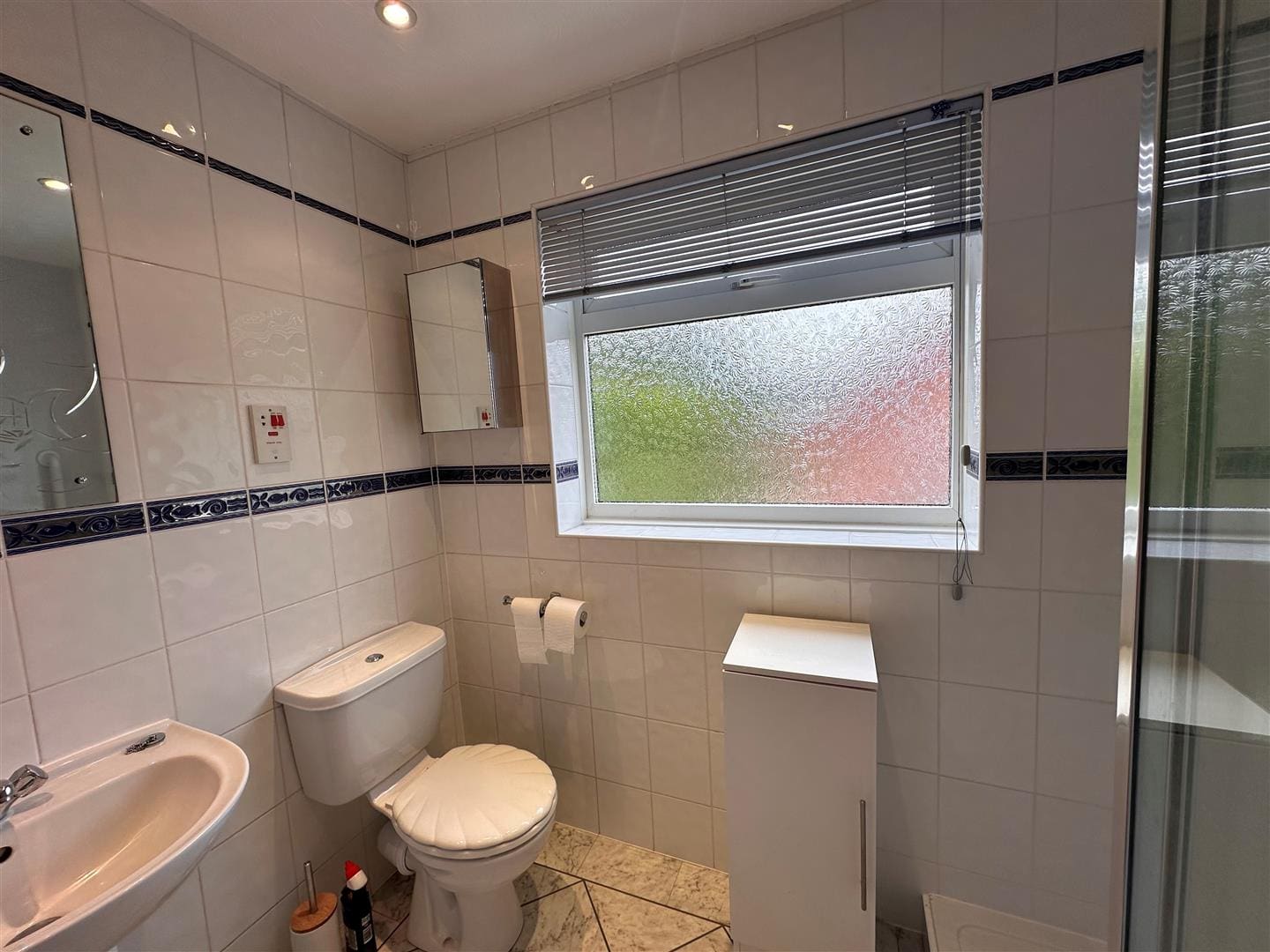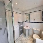 Walk in shower cubicle with bar mixer shower and shower wall and tiled walls. WC and Hand Basin, ladder radiator and storage unit. Inset spotlights, extractor fan and frosted window overlooking the rear of the property. Part tiled wals