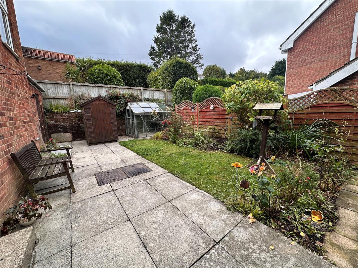 Driveway leading to garage which has light and power and a personnel door to the rear garden. Hedge surrounding the front and side of the property with lawn, mature borders and shrubs. Gated access at the side to the rear garden which has paved patio, lawn, mature borders and shrubs. Greenhouse and garden shed. Outside tap and security light.