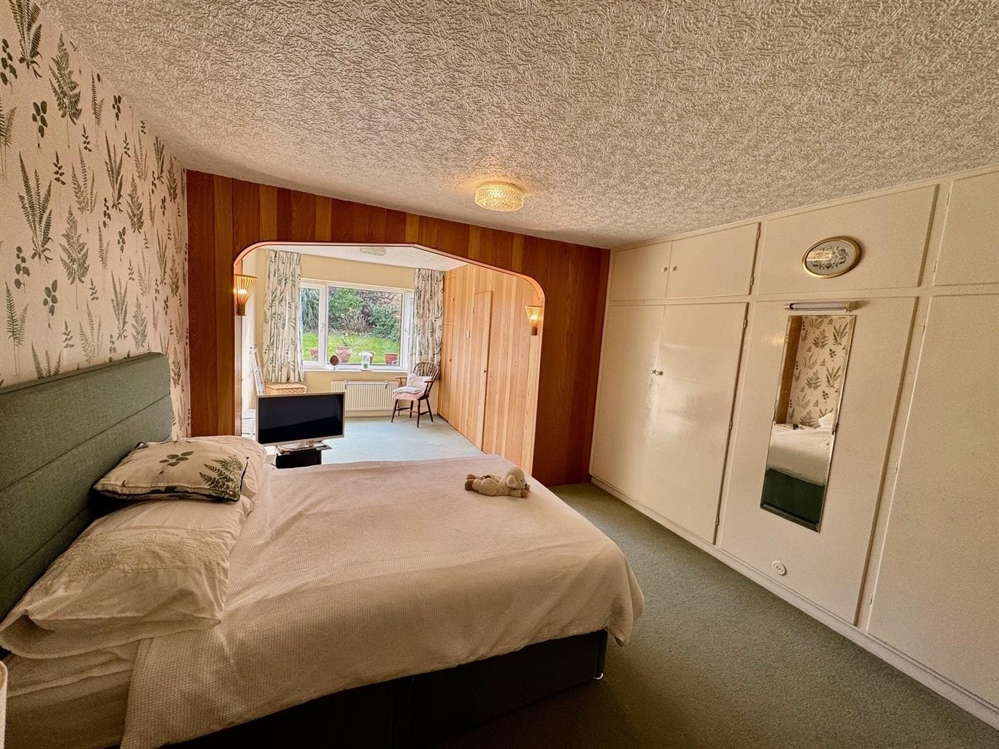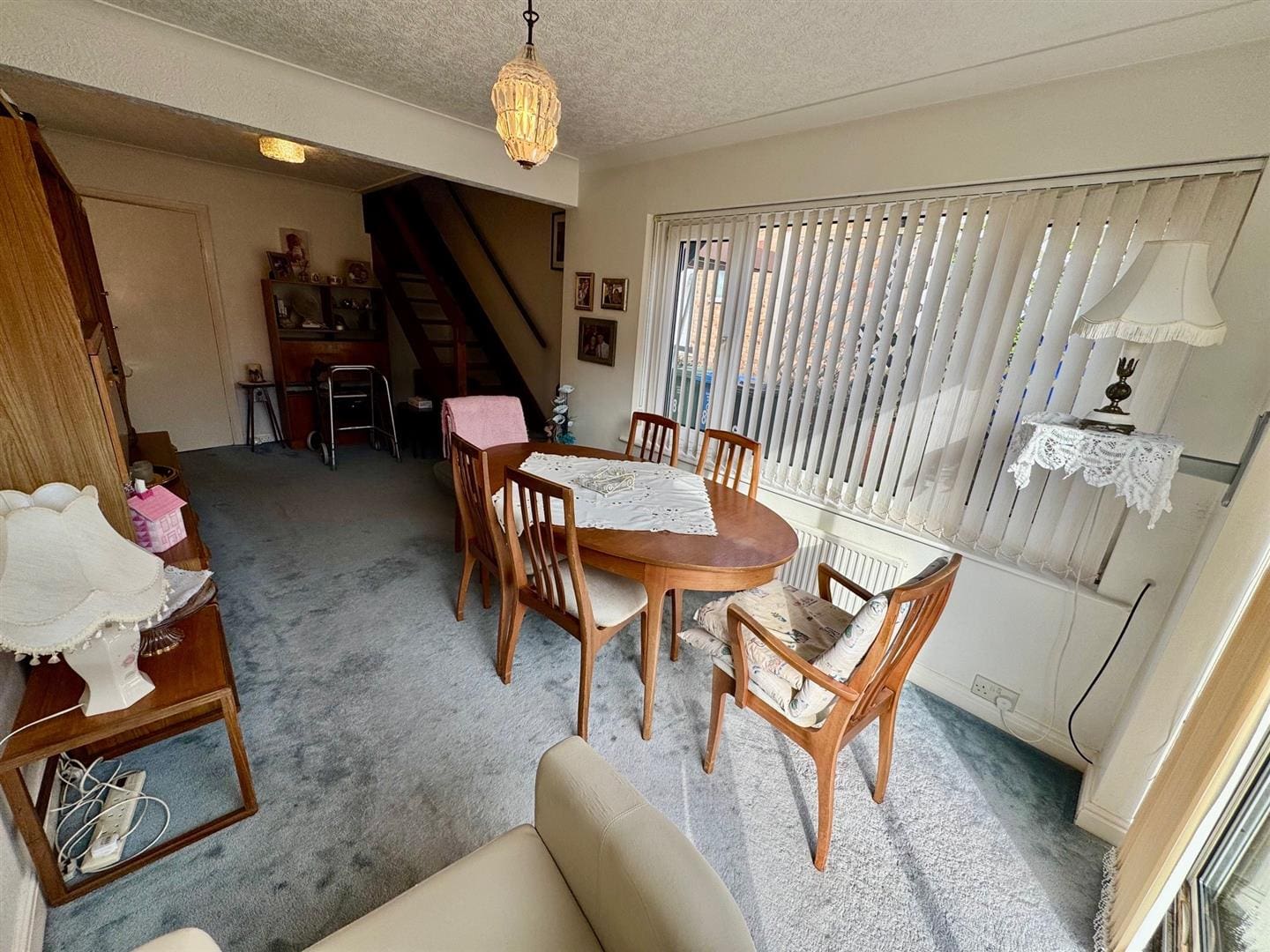 Upstairs, there are two generously sized bedrooms, both capable of accommodating double beds. Externally, the property benefits from off-street parking, a garage, and a lawned front garden. To the rear, there is a paved patio area leading to a further lawned garden, with shrubs to the side providing additional privacy.