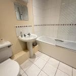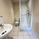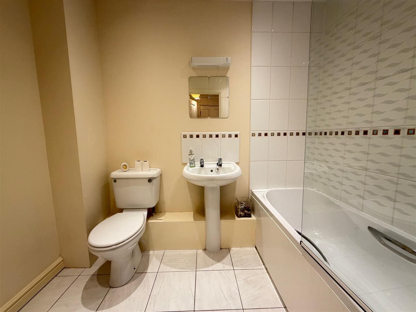 With three piece suite in while, shower over the bath, tiled floor, electric heater and ceiling spotlights