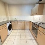 With a range of wall and base units, tiled floor, inset ceiling spotlights, automatic washing machine, inset electric hob and oven, fridge/freezer, stainless steel sink with mixer taps and tiled splash backs