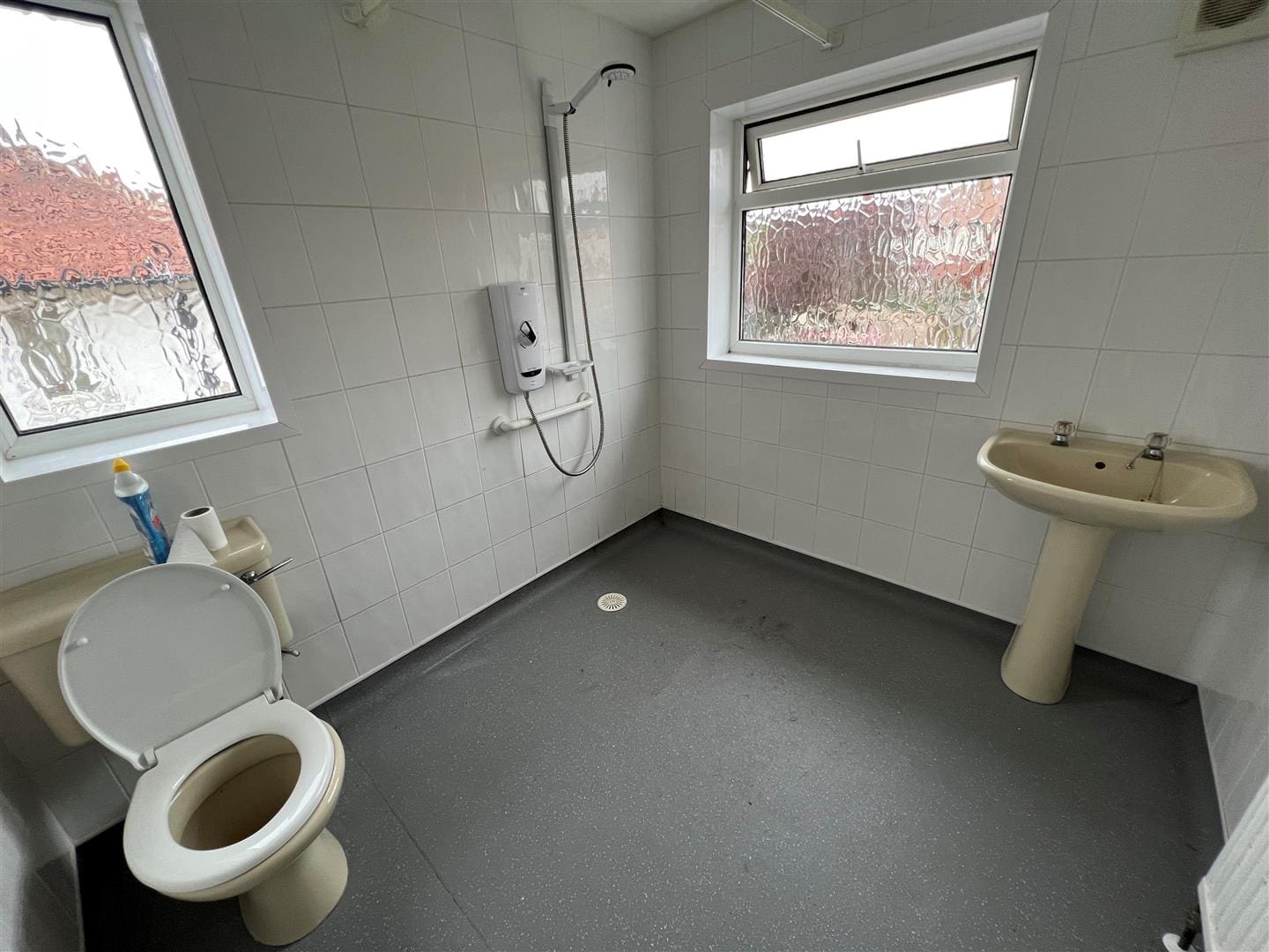 A good sized tiled wet room/shower room with a an electric shower, non slip flooring W.C. and hand wash basin with two windows one to the side and one to the rear.