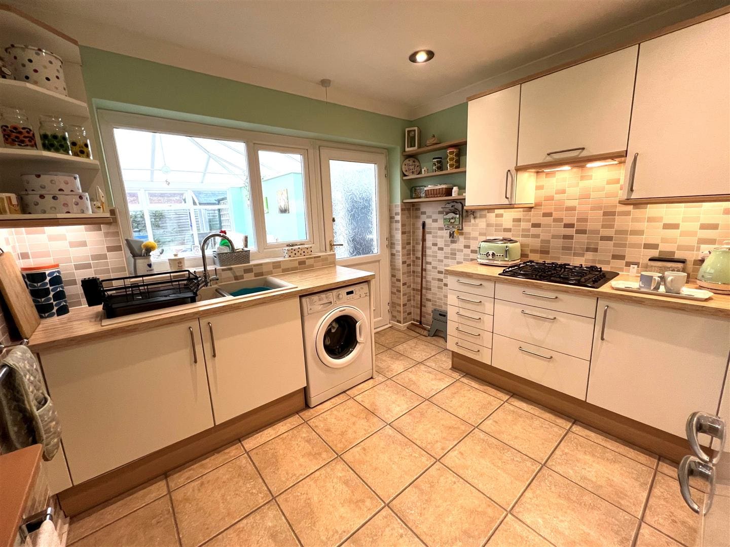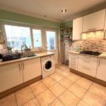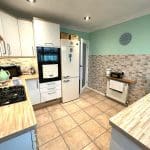 With a range of wall and base units the kitchen is partially tiled with composite worksurfaces and a one and a half resin sink and drainer. The tile effect floor is vinyl laminate , there is a radiator, a gas hob, electric oven and space for a fridge freezer and washing machine . There is a UPVC door leading into the conservatory the kitchen window looks into it.