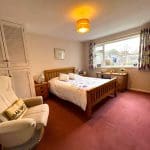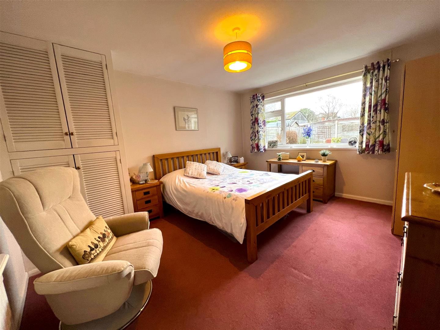 A double ground floor bedroom with a large window overlooking the rear garden, built in cupboards , radiator and carpet.