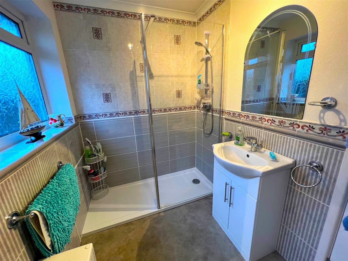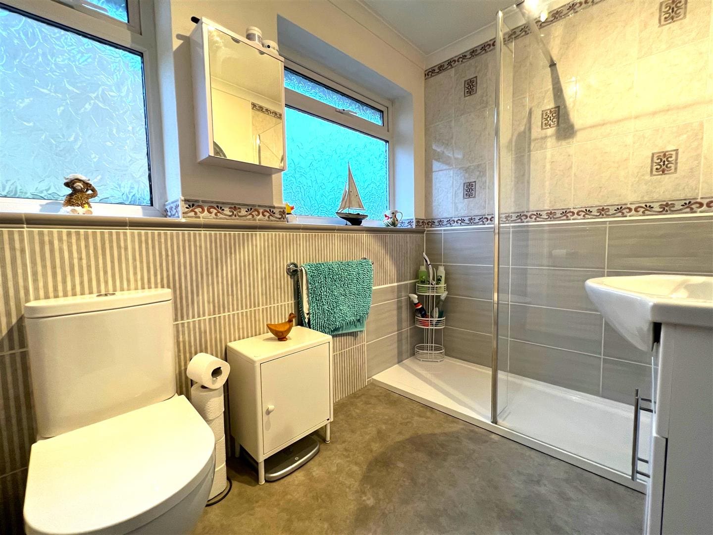 3 piece bathroom suite with walk in shower. 2 frosted UPVC windows overlooking the side of the property.