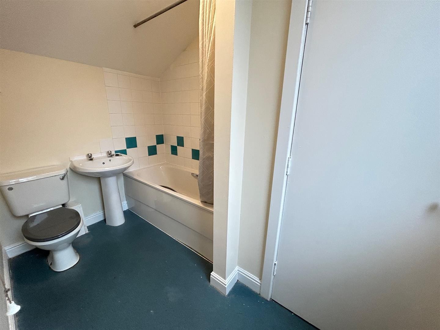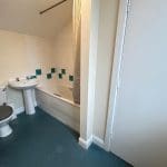 with white three piece suite, shower over the bath, radiator and window
