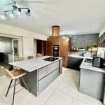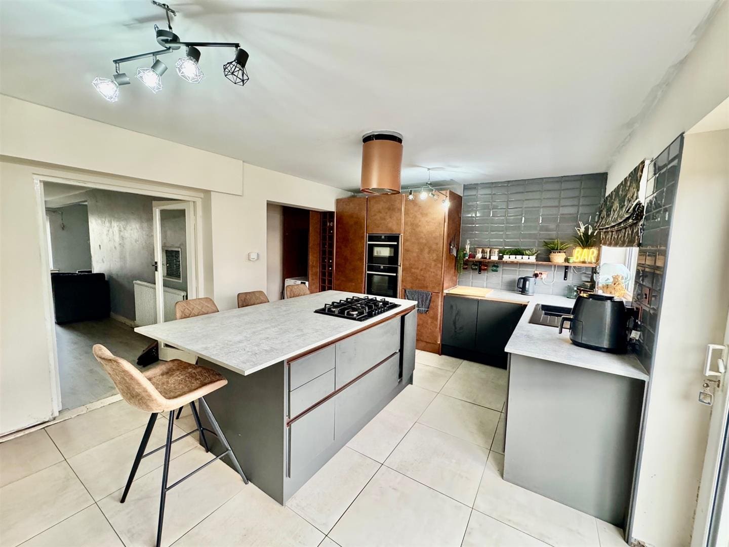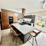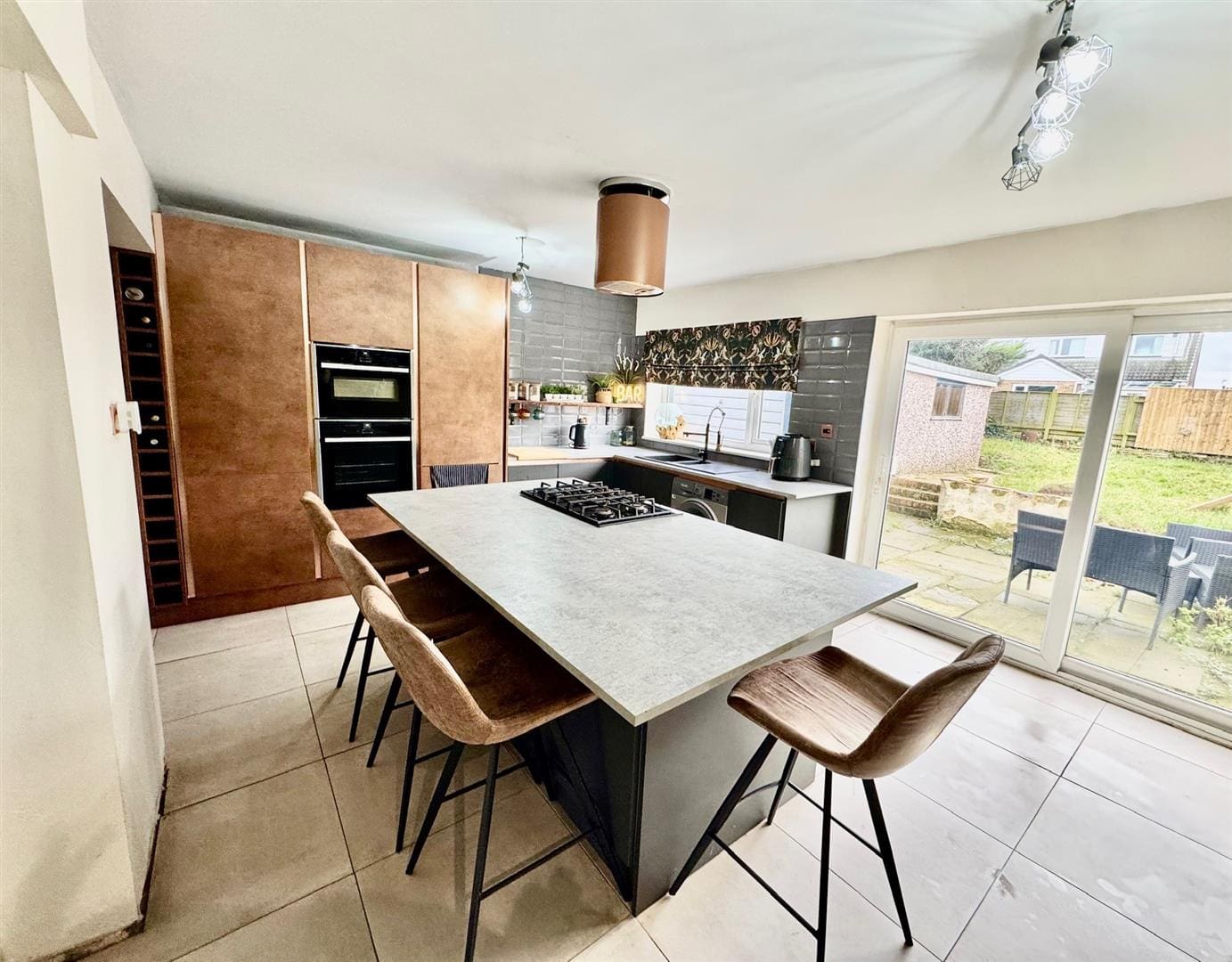 With a range of wall, base and drawer units, features Island including gas hob and storage. Integrated fridge freezer, oven, grill and microwave, built in bottle storage, plumbing for dishwasher or washing machine. Tiled flooring and walls, ceramic sink unit, ceiling extractor fan and overhead lighting. Patio doors leading to rear patio area and garden. UPVC windows overlooking the rear of the property.