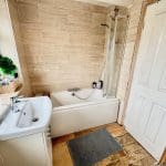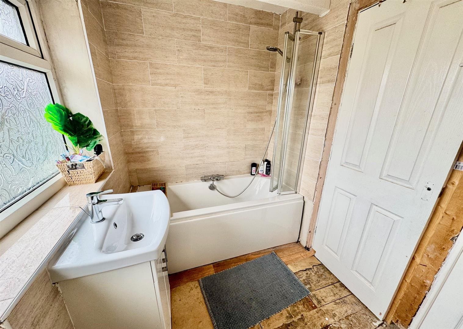 Frosted UPVC window overlooking the rear of the property. Bath, with overhead shower, hand basin and WC. Tiled walls, wooden flooring and overhead lighting