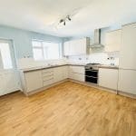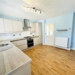A kitchen / dining room with a range of modern wall and base units , composite worktops and a stainless steel sink and drainer. There is a gas hob, electric oven and extractor, partially tiled walls and laminate flooring. There is a single glazed window that looks into the utility area.
