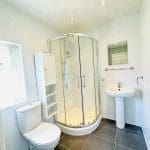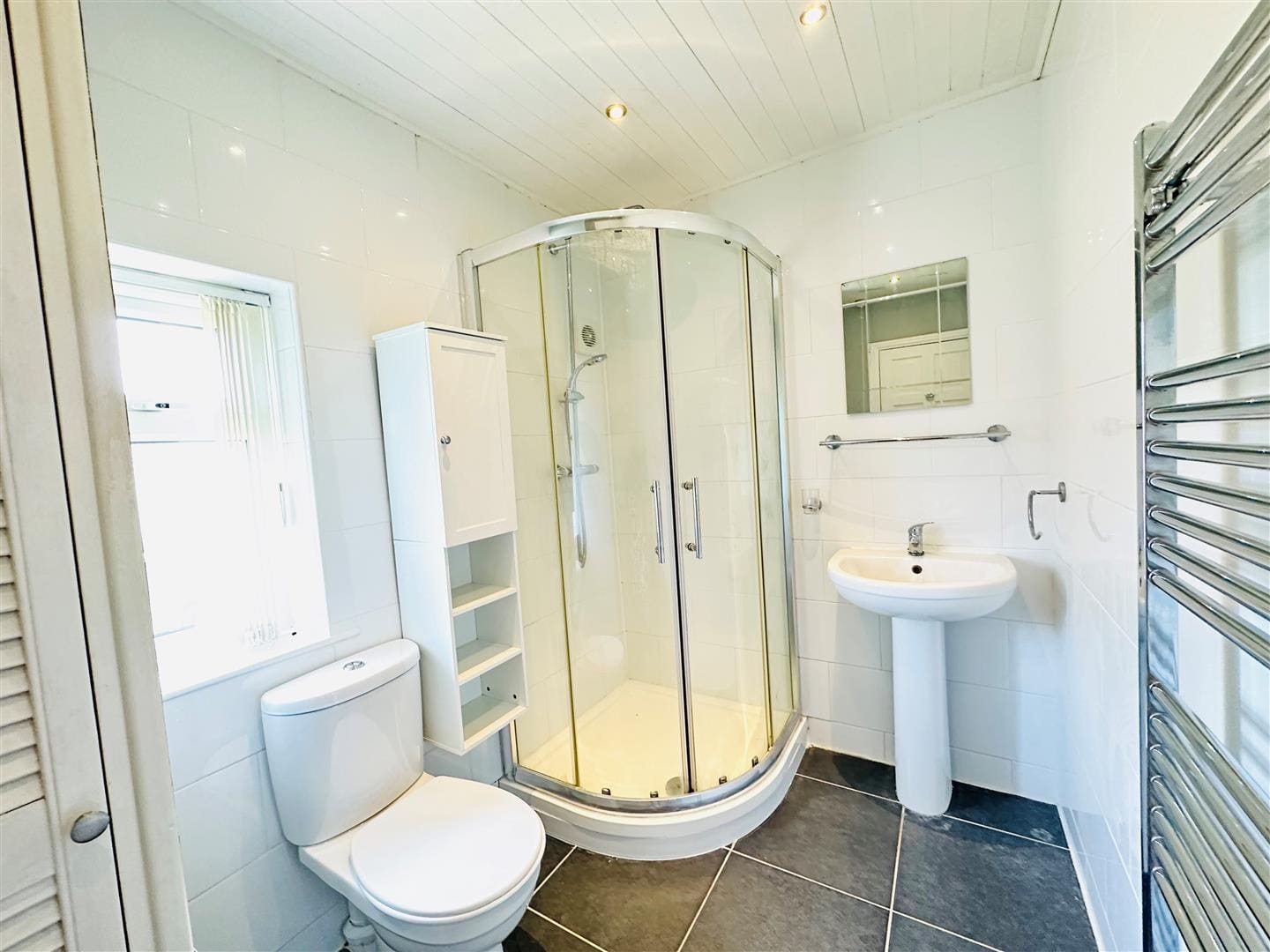 A modern shower room with a shower cubicle. W.C., hand basin and heated towel rail. This room is tiled with a tiled floor and a small UPVC double glazed window.