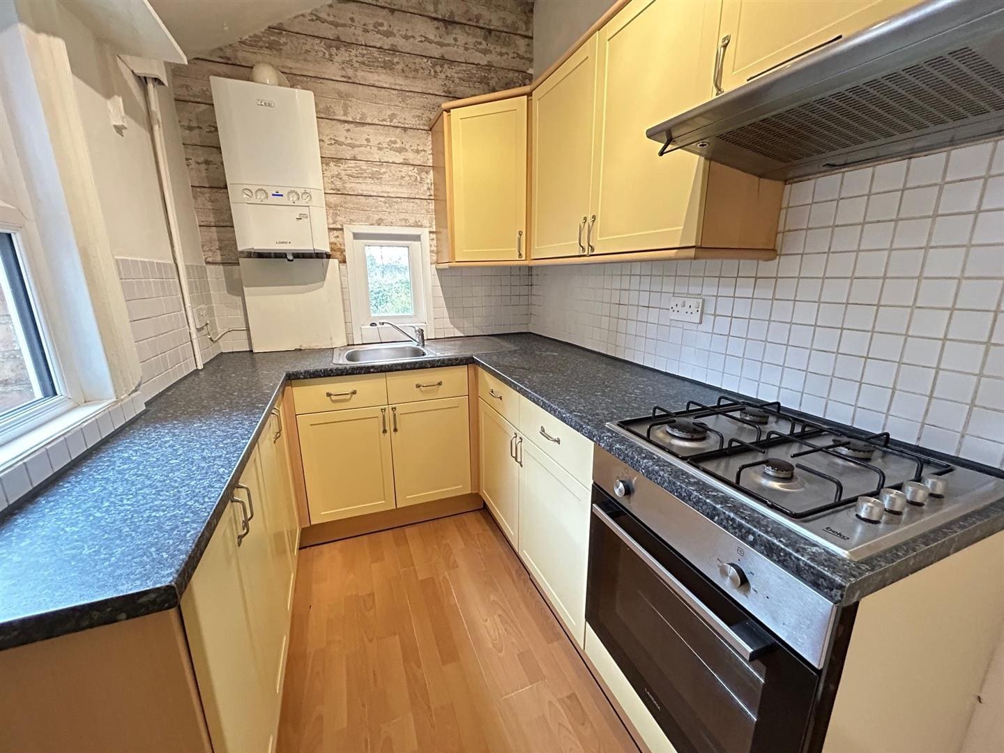 with a range of base and wall units, stainless steel sink unit, tiled splashback, integrated oven and hob with extractor over, space for fridge freezer, window and door leading to outside