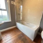 with white three piece suite, shower over the bath, window and heated towel rail