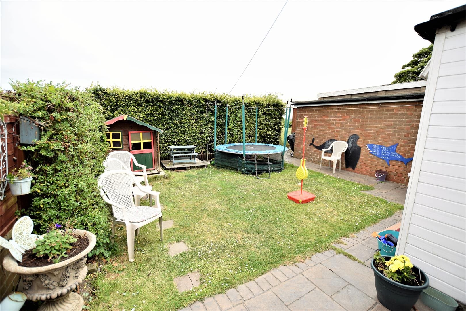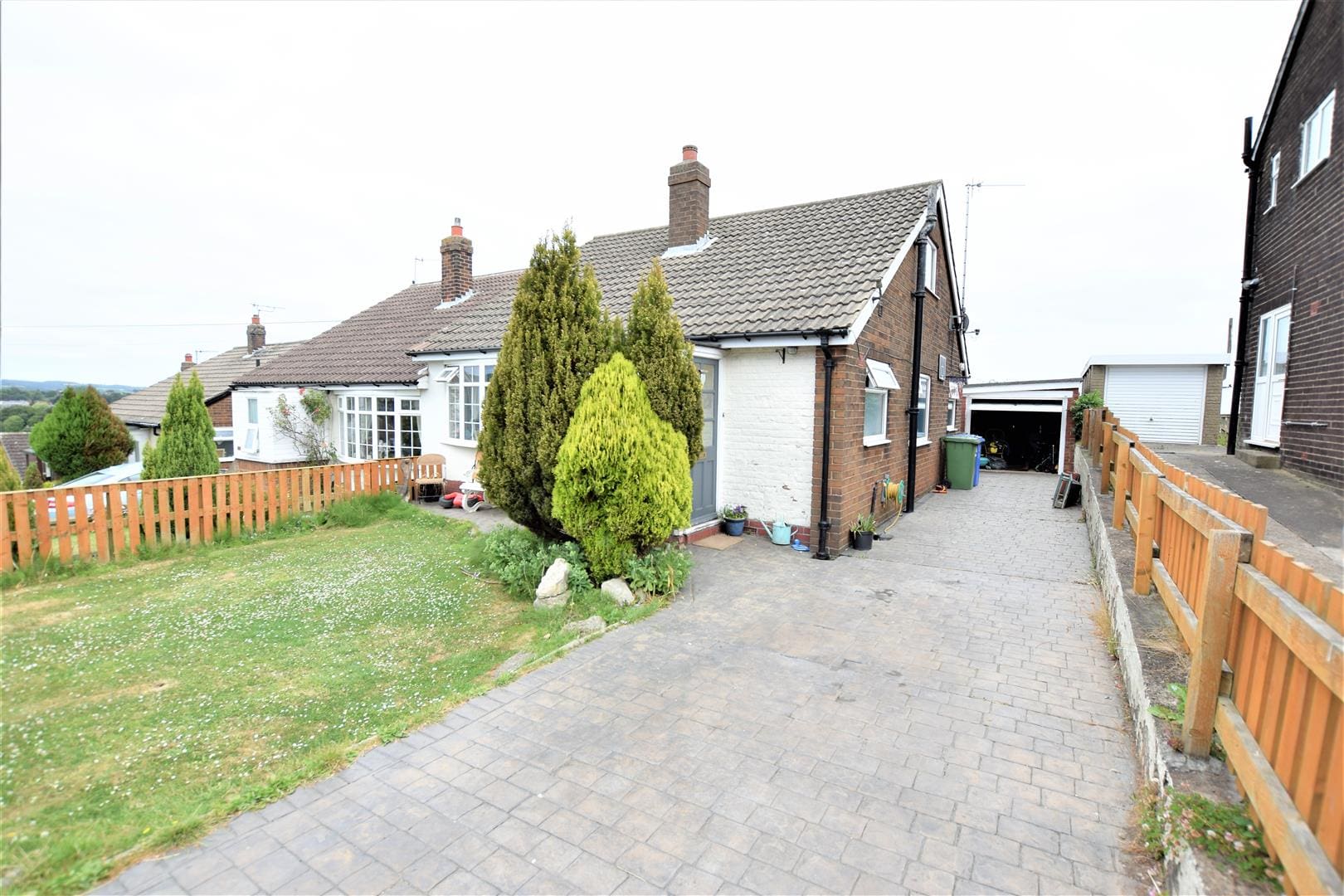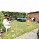 Block paved driveway adjacent to lawned front garden. Main hedge provides privacy to the property, with a few further bushes near the main front entrance. Driveway leads to the garage which is at the sid eof the property. Rear gate leads into garden, again mainly lawned with flagstone path and sitting area. Hedge and fencing provides further privacy. External rear gate leads into large field at the rear of the property.