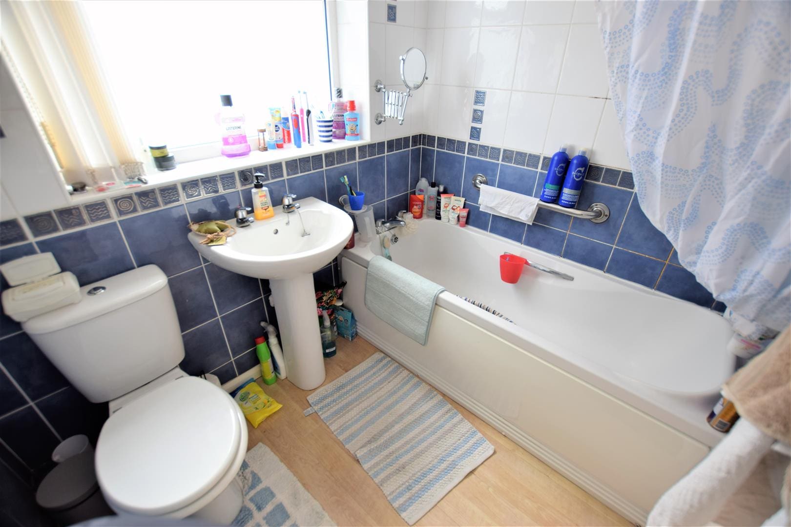 Matching 3 piece suite, electric shower over the bath, linoleum flooring, electric heater and side aspect frosted uPVC window