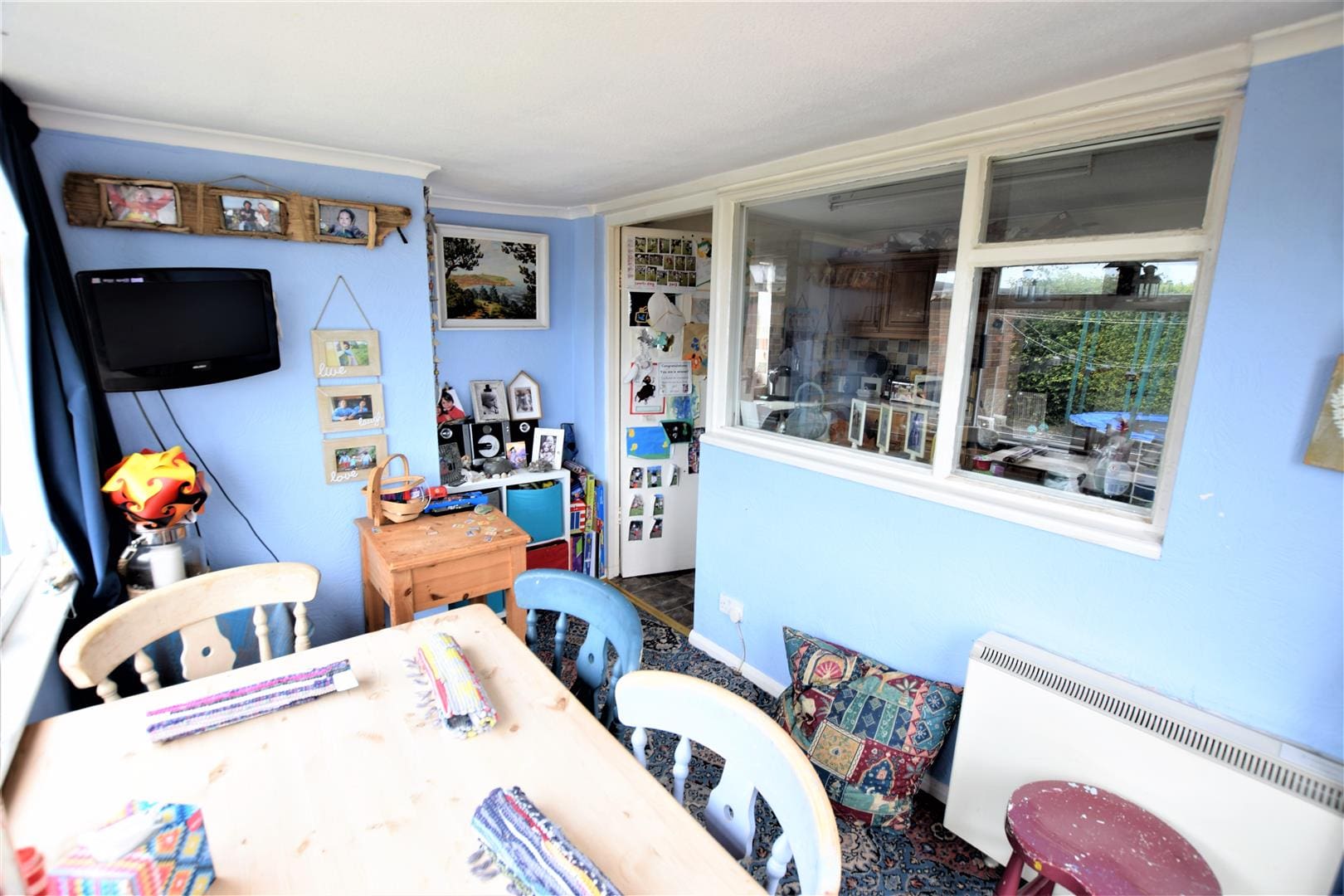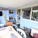 Large kitchen space with uPVC window overlooking the side of the property and a wood framed window looking into the dining room/sun room. With a range of wall and base units. Stainless steel sink and matching mixer tap. Electric hob with extractor hood over. Fitted electric oven and grill. Linoleum flooring, tiled splashbacks, overhead strip light and space for fridge freezer, washing machine and dishwasher.