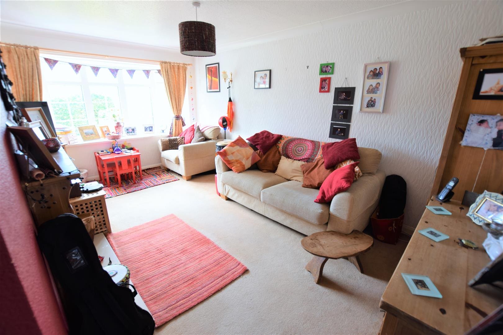 Side aspect uPVC window, carpet, overhead light and electric heater.
