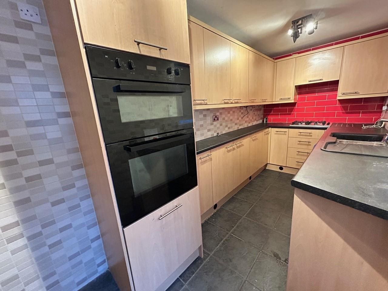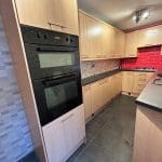 with a range of base and wall units, integrated oven, gas hob, resin sink unit, tiled splashbacks, space for washing machine, space for fridge/freezer and door to rear yard