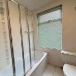 with a white three piece suite, shower over the bath, heated towel rail and window