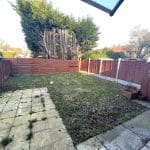 Enclosed rear garden with patio and lawn.