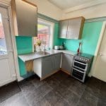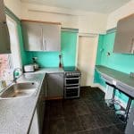 Range of wall, drawer and base units with co-ordinating worktop, breakfast bar area and stainless steel sink with mixer tap. Side facing UPVC window, overhead light, laminate flooring. Spaces for gas cooker and fridge. Door to the side of the property.