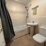 With a white three piece suite having a shower over the bath, electric towel rail and a cupboard housing the Hot Water Tank