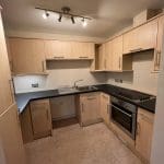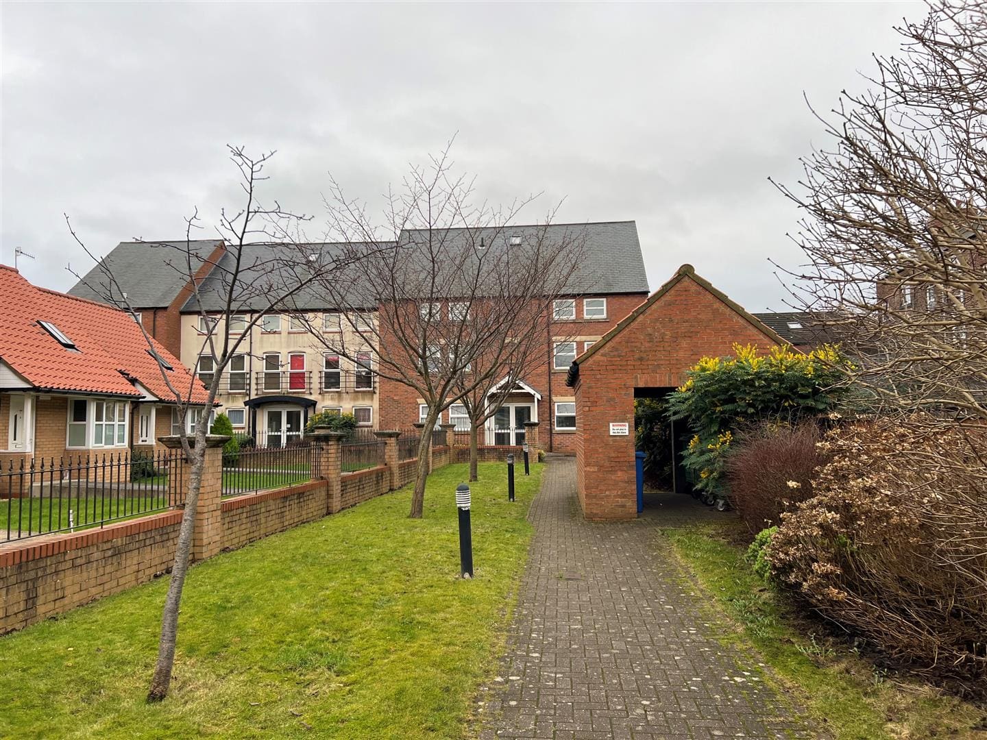 A communal walkway through some gardens leads towards the flats this area is well lit and there is a storage area for the bins.