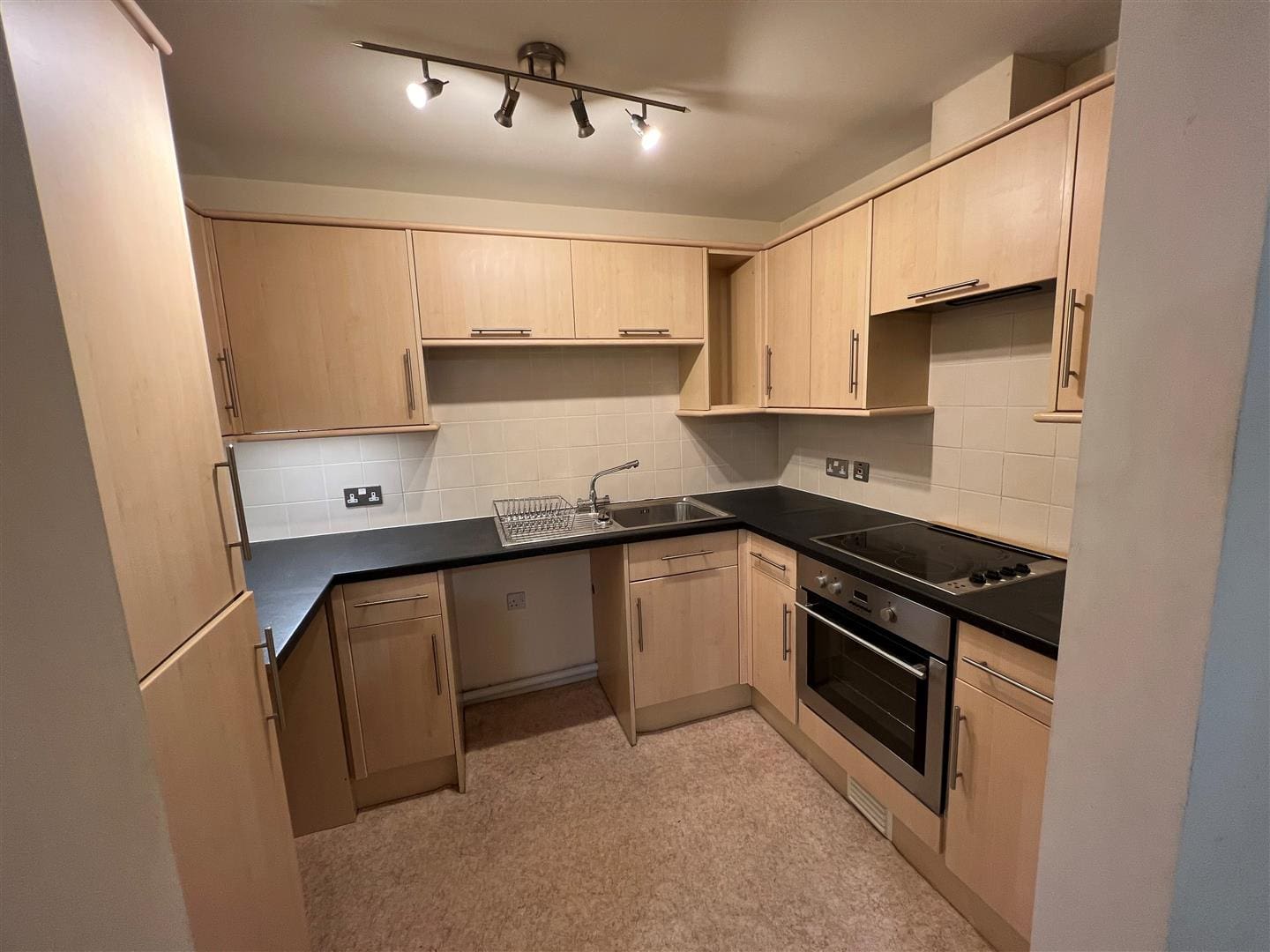 A modern kitchen with a range of wall and base units, electric hob and oven, integrated fridge/freezer, stainless steel sink, mixer tap, plumbing for automatic washing machine and part tiled walls