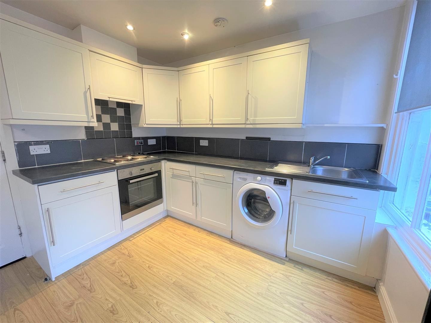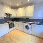 With a range of floor and wall units, stainless steel sink, integrated oven, hob and fridge freezer. Extractor fan and washing machine
