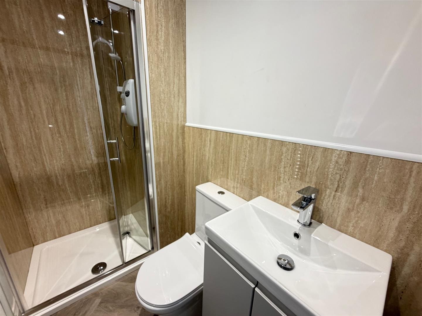 with WC, hand basin and shower cubicle with electric shower