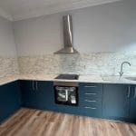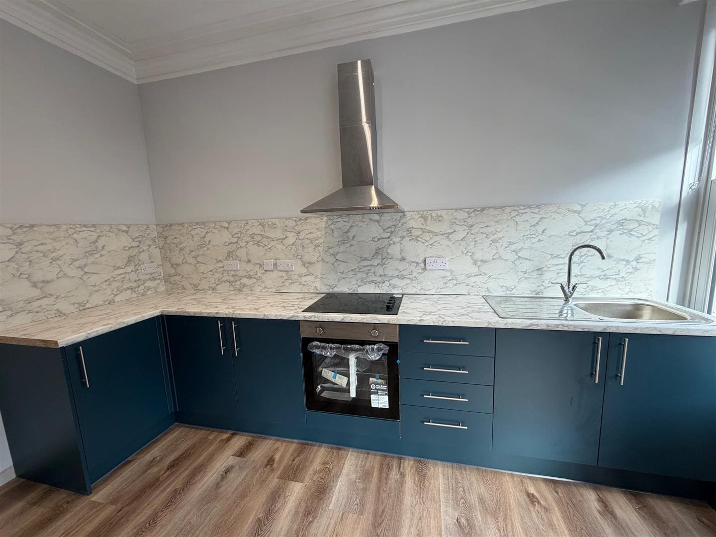 with a range of base units, stainless steel sink, splashback, integrated oven and hob with extractor over, space for fridge/freezer, window and electric heaters