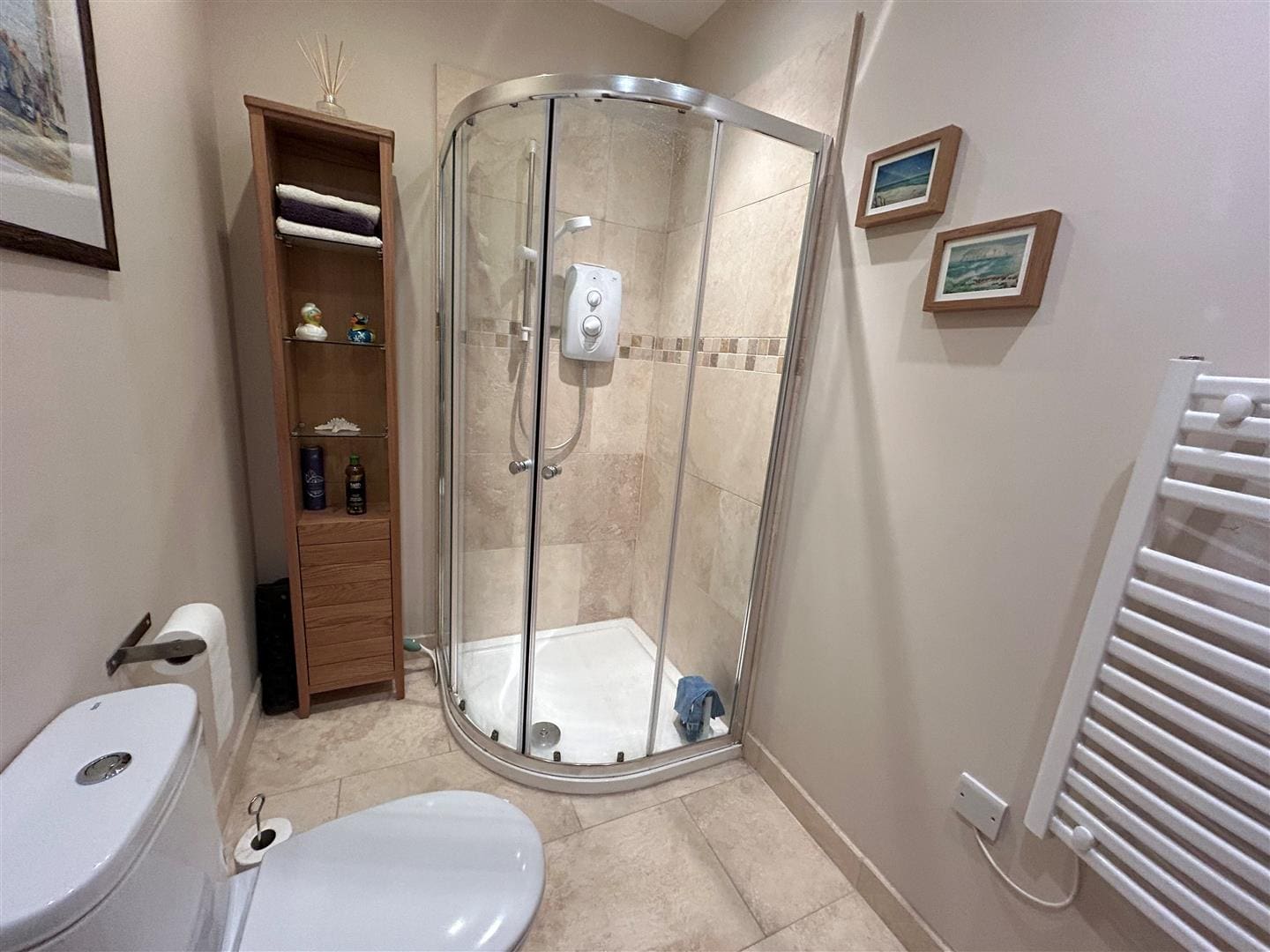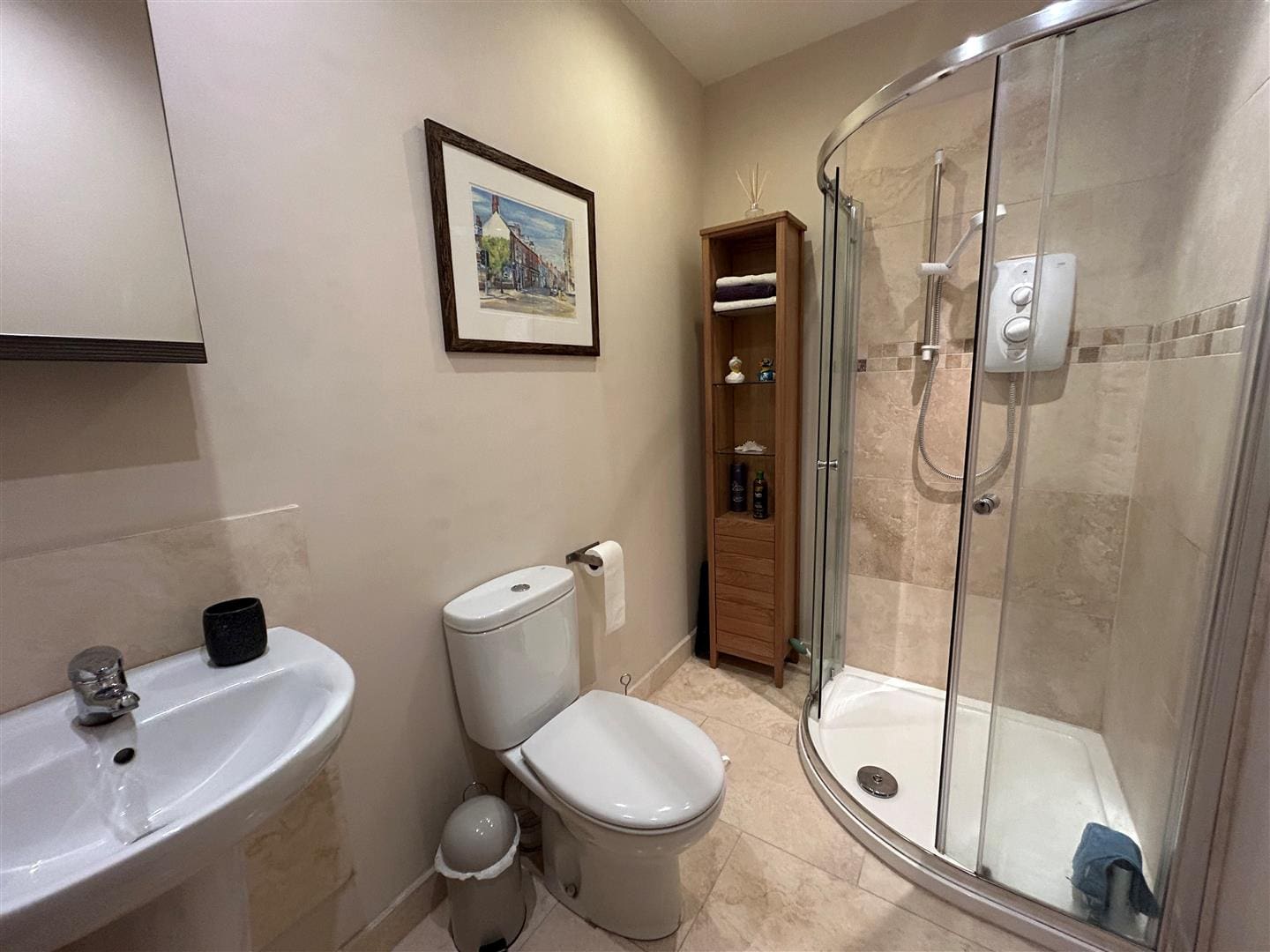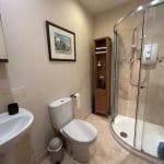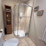 Tiled shower enclosure with electric shower. Hand basin and WC. Extractor fan and overhead light. Heated towel rail.