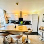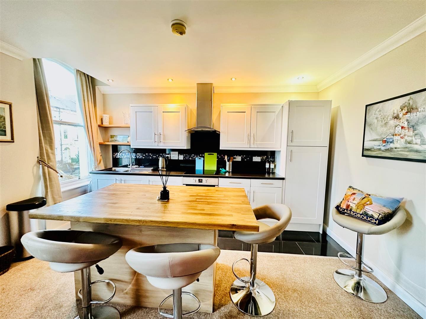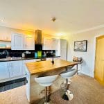 Range of wall, base and drawer units with co-ordinating worktop, sink unit and decorative splashback. Fitted electric hob, oven and stainless steel extractor unit over. Island unit with space for fridge under and bar seating.