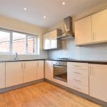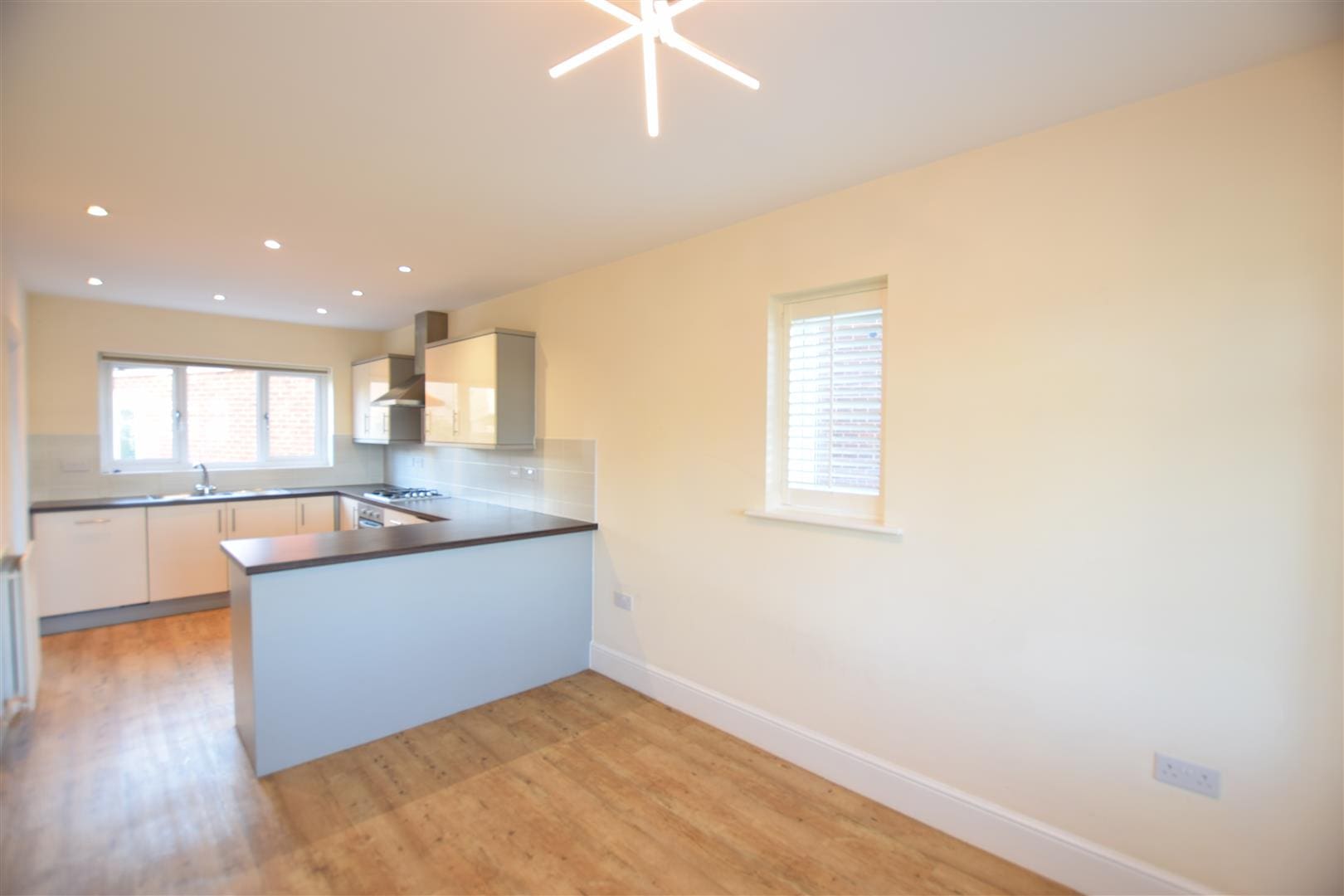 An open-plan room with kitchen and dining area. The kitchen has a range of base units with laminate worktop over, wall units, stainless steel sink, tiled splash-back, integrated appliances include; gas hob, electric oven, undercounter fridge/freezer and dishwasher. The dining area has a bay window with shutter blinds, overlooking the front, a smaller window overlooking the side and radiator.