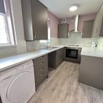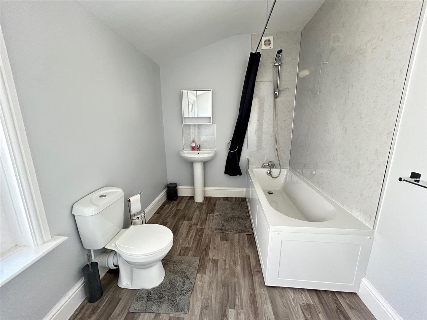 With a range of wall and base units, inset stainless steel sink, tiled splash backs, plumbing for automatic washing machine, space for dryer, integrated oven and hob with extractor over, space for fridge/freezer, radiator, window overlooking the rear and a door leading to the rear yard