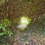 Driveway to the side of the property with lawn and mature hedge at the front.