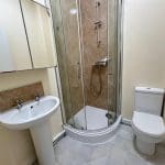 with white WC and hand basin, shower cubicle, extractor fan and underfloor heating